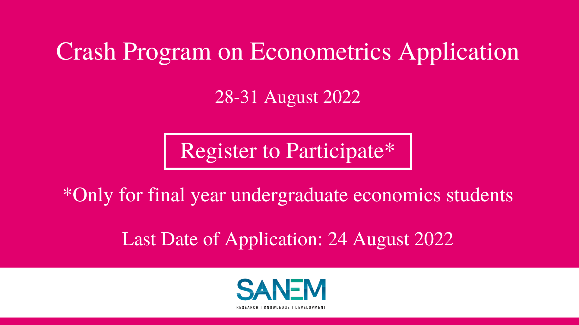 SANEM will organize a crash program on econometrics application from 28 -31 August 2022. The program will be conducted over Zoom, from 3-5 pm Bangladesh Time on the respective days. The program will be conducted by the researchers of SANEM. Dr Selim Raihan [....]