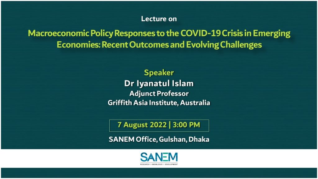 SANEM will organize a lecture by Professor Iyanatul Islam to explore emerging economies’ macroeconomic policy responses to the COVID-19 pandemic, its recent outcomes and evolving challenges. The lecture will be moderated by Dr Sayema Haque Bidisha, Professor, Department [....]
